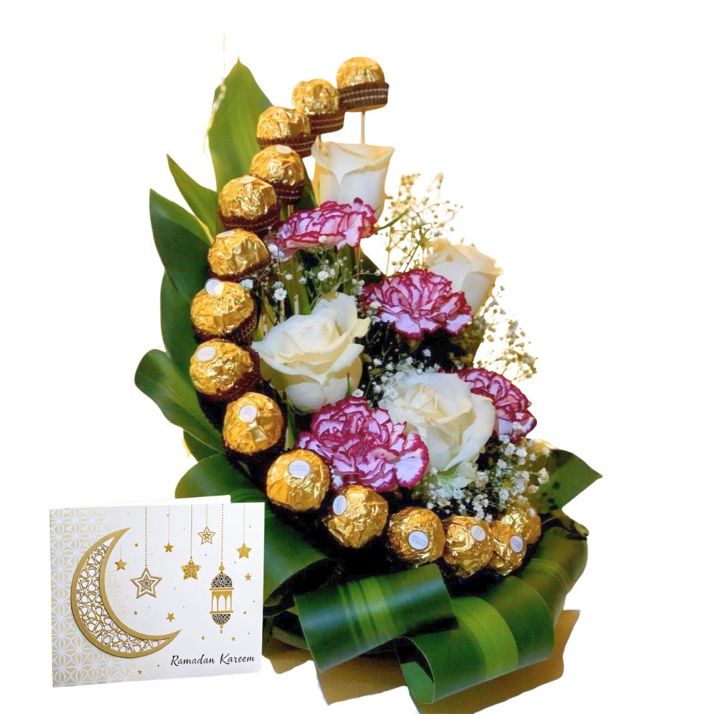 Celebrate the spirit of Ramadan with this elegant and luxurious floral gift arrangement, beautifully presented to share blessings and joy. This stunning design features 6 fresh white roses and delicate pink carnations, artistically arranged with lush green leaves and accented with 16 premium Ferrero chocolates for a touch of indulgence.