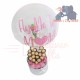 cylinder white box decorated with 15 pink rose and 17 pcs of ferrerp roche decorated on top with a bubble balloon that has roses inside