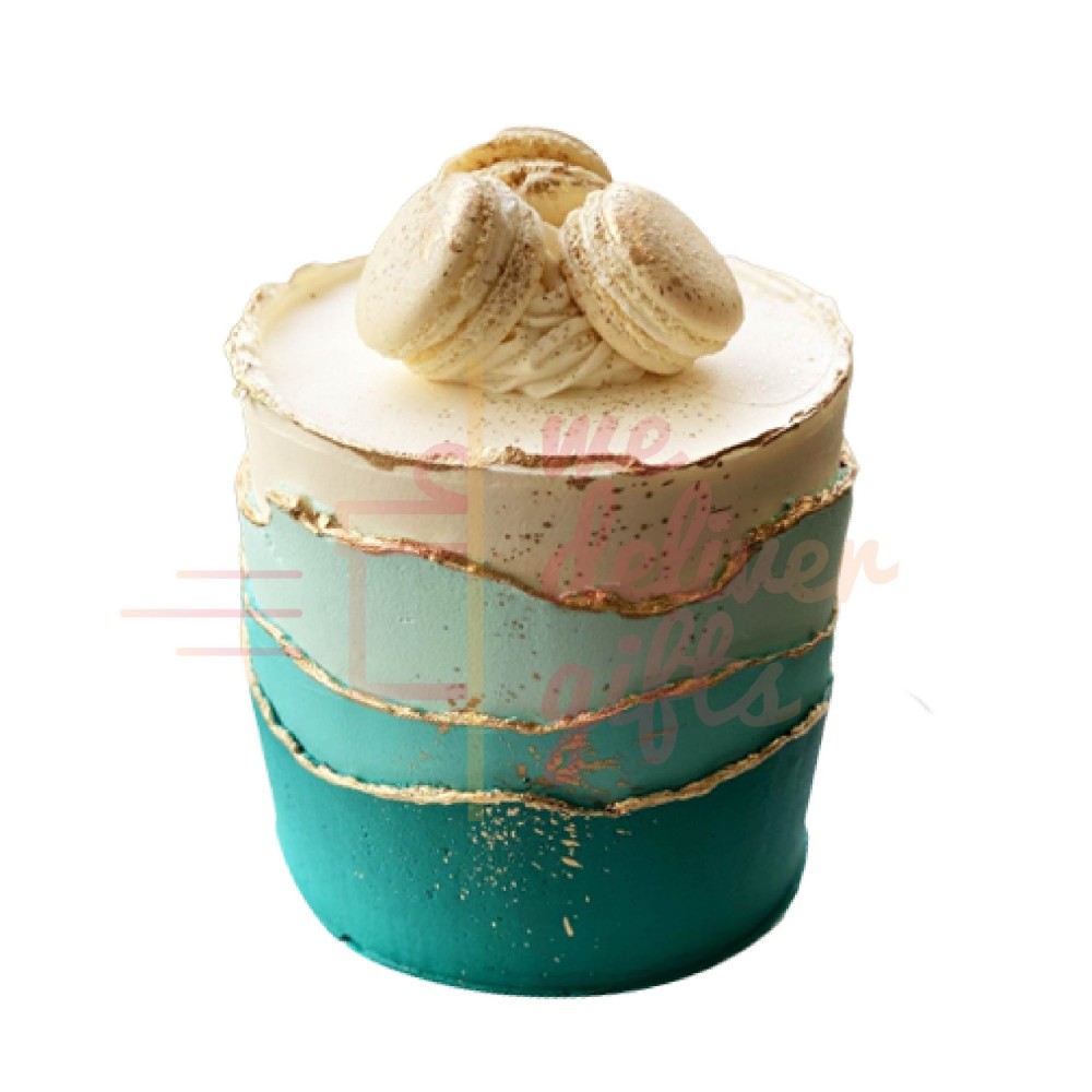 SOft Blue Ocean Vibe Cake Decorated with gold and Macaron