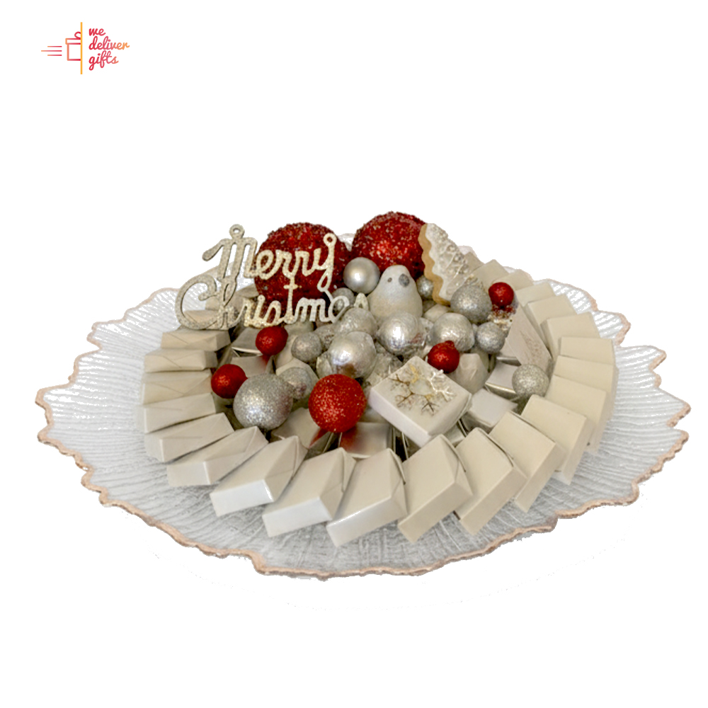 christmas tray arragned with 1420gram chocolate and some decorarion . the perfect chocolate tray gift tray for this season