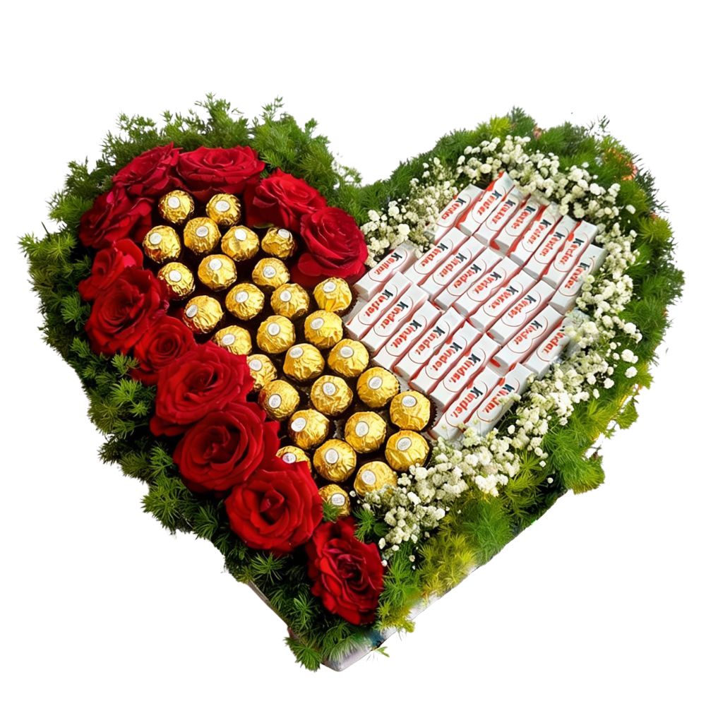 The big one include arround 32 pieces of ferrero rocher and 24 kinder chocolate bars in additional of 15 red roses all arround the first half , well organised.