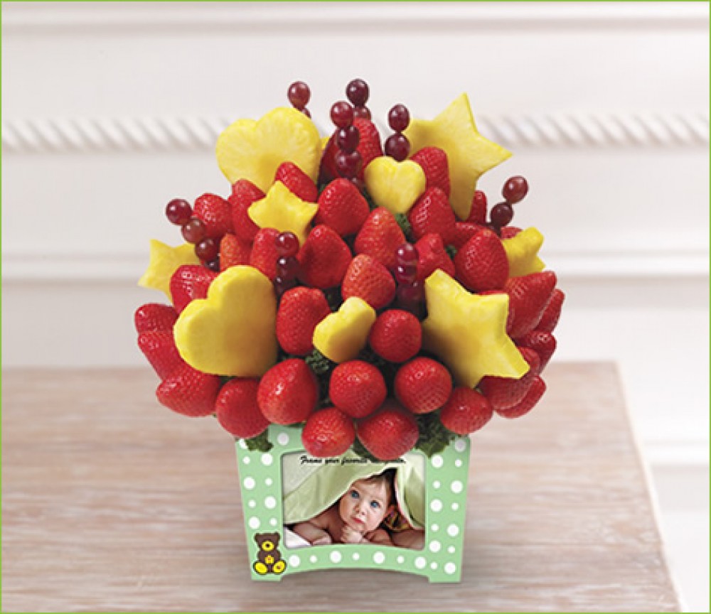 A perfect gift to congratulate new parents! They’ll enjoy our New! Baby bouquet overflowing with fresh strawberries, grapes, pineapple stars & pineapple hearts designed in a novelty container.